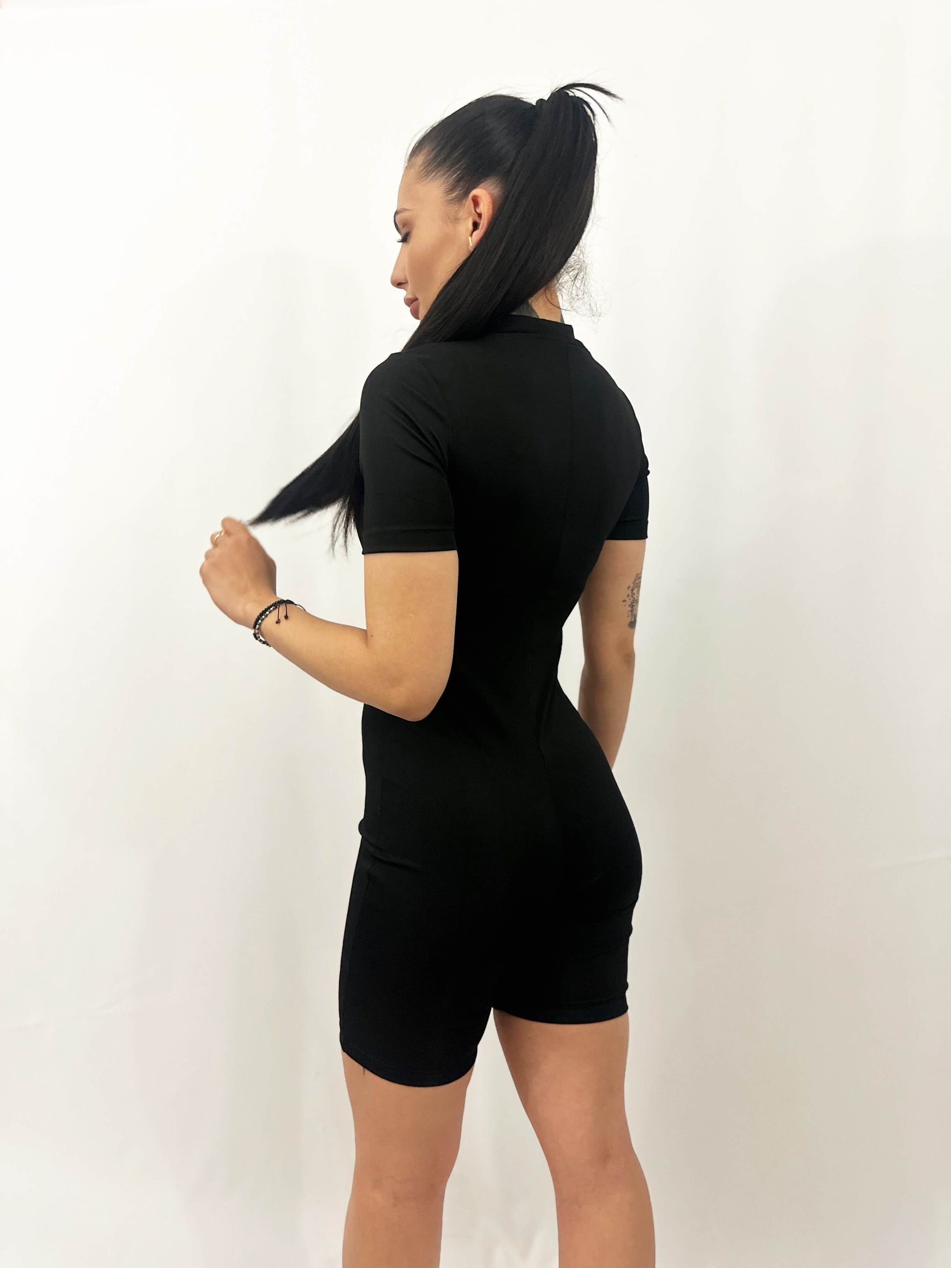 Definește-ți stilul în această salopetă neagră de vară, confecționată din material diver (scuba), ce oferă un echilibru ideal între confort, elasticitate și rafinament. Croiala modernă pune în valoare silueta, iar textura fină a materialului se așază perfect pe corp, fără să incomodeze. Este alegerea ideală pentru evenimente de zi, ieșiri în oraș sau vacanțe, adaptându-se ușor de la un look casual la unul elegant.