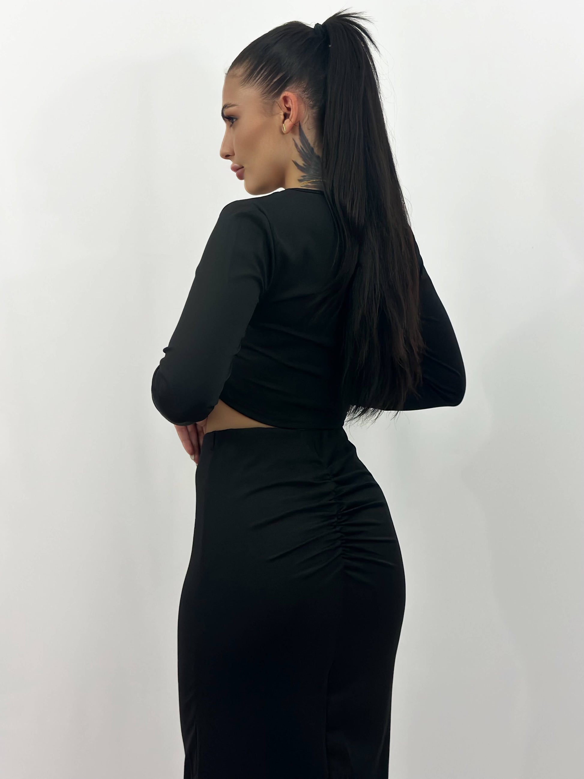 Redefinește-ți stilul cu acest set de damă din două piese, compus dintr-o bluză chic și o fustă midi, cu crăpătură laterală, confecționate din material scuba – elastic, neted și perfect pentru un look sofisticat. Fusta peste genunchi alungește silueta, iar bluza completează armonios ținuta, transformând acest set într-o alegere ideală pentru evenimente, ieșiri în oraș sau ținute office cu atitudine.